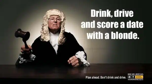 Il primo esempio arriva dall’Australia, il lavoro è stato commissionato dalla Office of Road Safety e si legge: “Bevi, guida e guadagnati un appuntamento con una bionda”. Il gioco di parole inglese rende variamente impersonificabile quel “blonde” che in questo caso fa palese riferimento al giudice con la sua bionda parrucca.