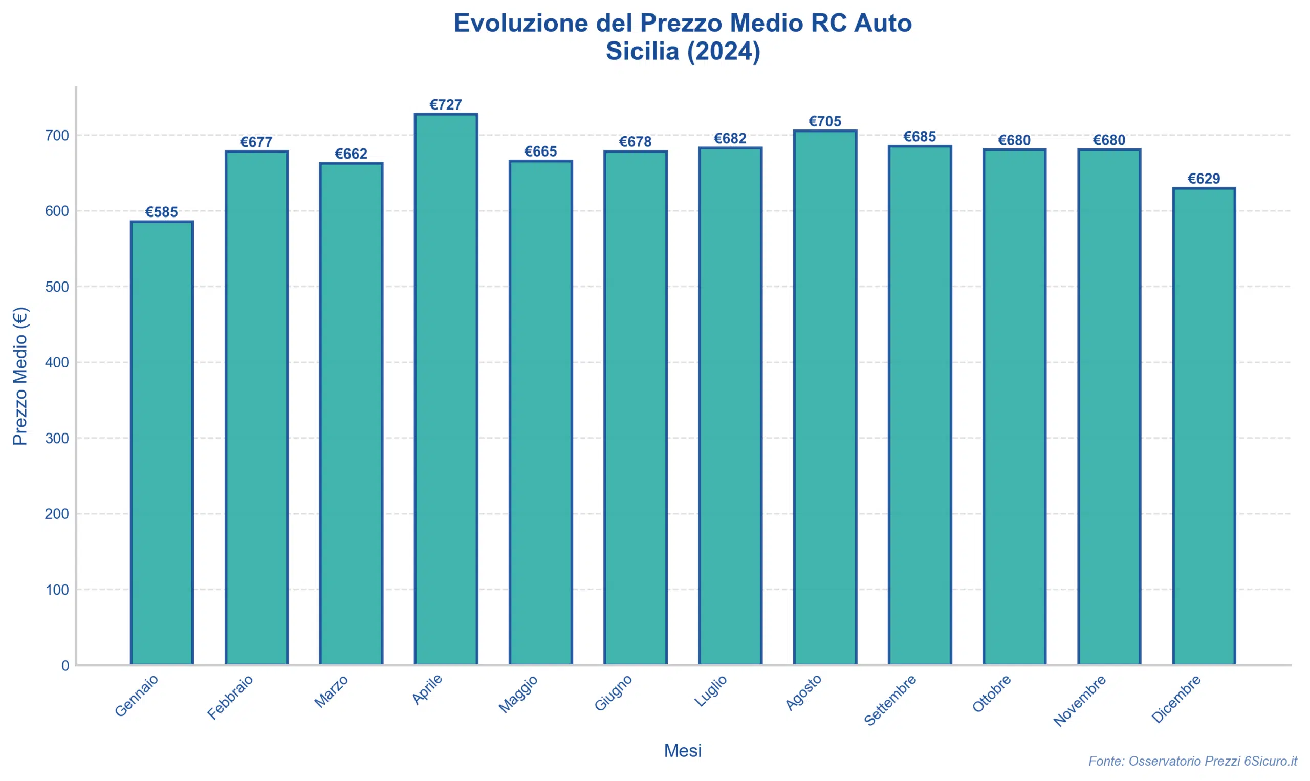 I premi assicurativi medi per auto in Sicilia nel 2024 mostrano una notevole variabilità tra i mesi, con un miglior premio medio che oscilla tra 585,53€ a gennaio e 705,19€ ad agosto.