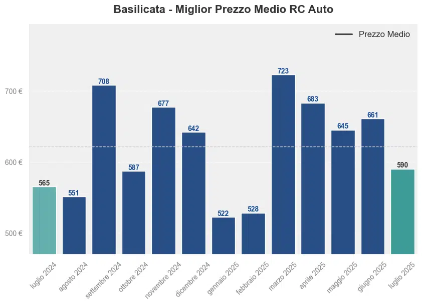 In Basilicata il prezzo medio dell’assicurazione auto è stato di 590,87€ a luglio 2025. Confrontando i prezzi con lo stesso mese del 2024, emerge un aumento del 4,44% rispetto ai 565,73€.