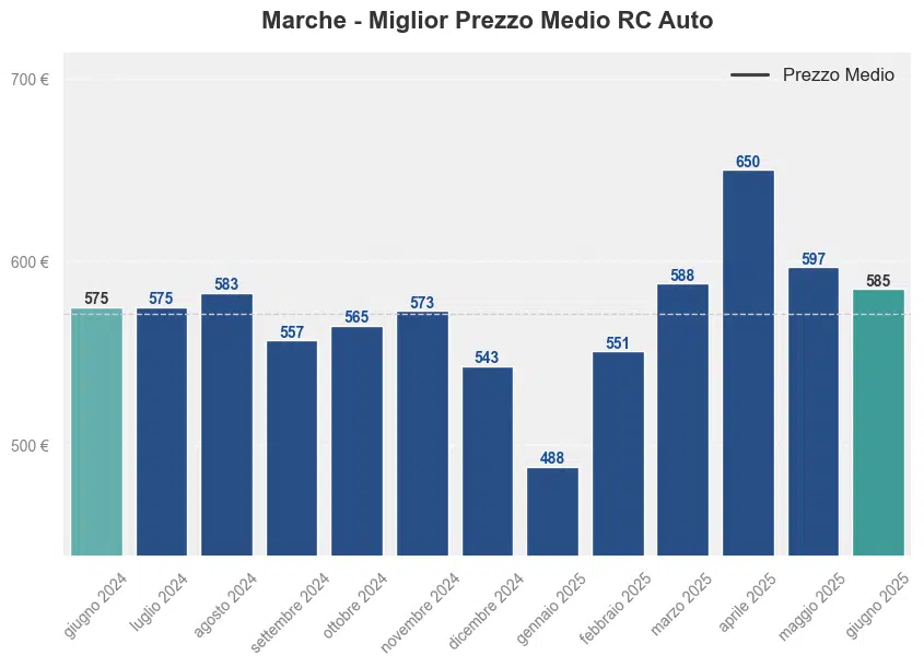Il prezzo medio dell’assicurazione auto nelle Marche a giugno 2025 è stato di 585,16€. Confrontando i prezzi con lo stesso mese dell’anno precedente, si osserva un aumento dell’1,77%, dato che a giugno 2024 il premio medio era di 575,0€.