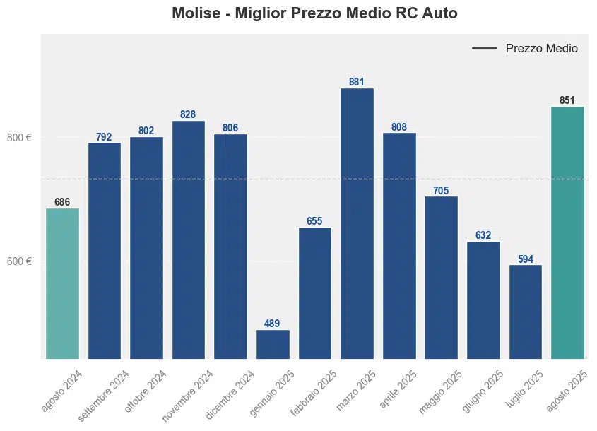 Ad agosto 2025 il prezzo medio dell’assicurazione auto in Molise è stato di 851,81€. Confrontando i prezzi anno su anno, si registra un +24,14% rispetto ai 686,19€ di agosto 2024.