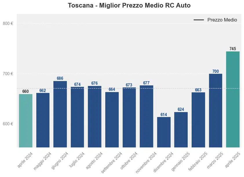 Il prezzo medio dell’assicurazione auto in Toscana ad aprile 2025 è stato di 745,33€. Rispetto allo stesso mese dell’anno precedente, si è registrato un aumento del 12,82%. Nel 2024, infatti, il premio medio RC era di 660,63€.