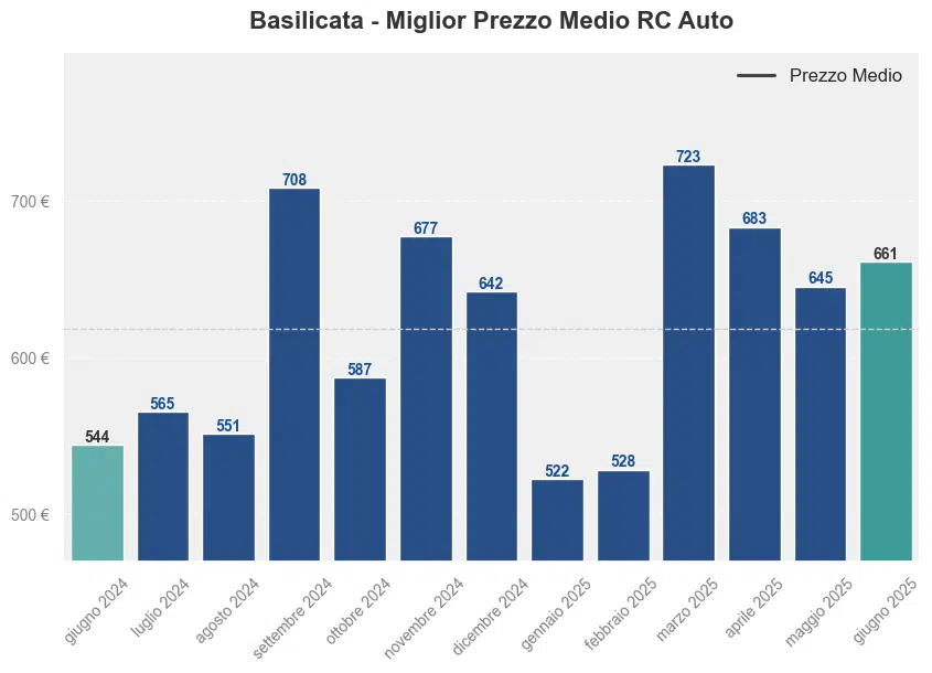 Il prezzo medio dell’assicurazione auto in Basilicata a giugno 2025 è stato di 661,31€. Confrontando i prezzi con lo stesso mese dell’anno precedente, si registra un aumento del 21,5%, dato che a giugno 2024 il premio medio era di 544,3€.