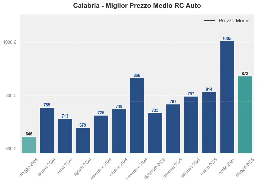 In Calabria, il prezzo medio dell’assicurazione auto a maggio 2025 è stato di 873,51€. Confrontando i prezzi con lo stesso mese dell’anno precedente, si registra un aumento del 35,07%, quando il premio medio era di 646,69€.