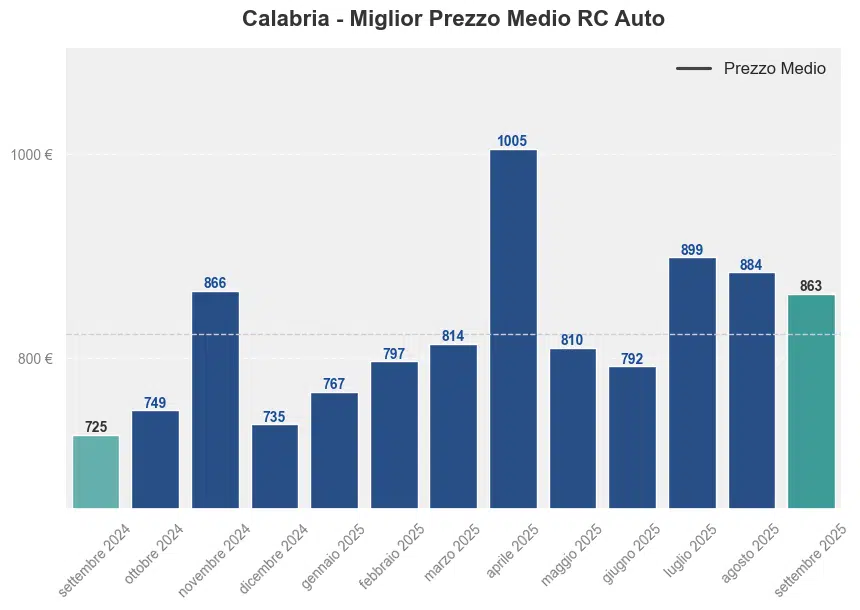 In Calabria il prezzo medio dell’assicurazione auto a settembre 2025 è stato di 863,34€.