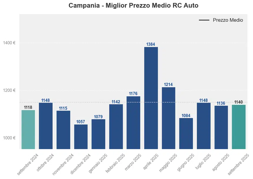 Confrontando i prezzi anno su anno, a settembre 2025 il prezzo medio dell’assicurazione auto in Campania è stato di 1140,01€, con un aumento del 1,96%. Nello stesso mese dell’anno precedente il premio medio RC era 1118,05€.
