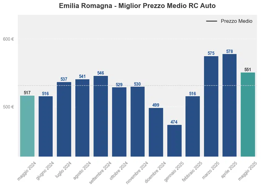 Il prezzo medio dell’assicurazione auto in Emilia Romagna a maggio 2025 è stato di 551,65€. Confrontando i prezzi con lo stesso mese dell’anno precedente, si registra un aumento del 6,56%, quando il premio medio era di 517,71€.