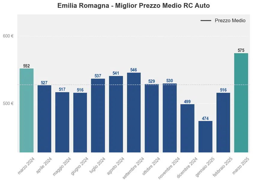 Il prezzo medio dell’assicurazione auto in Emilia Romagna a marzo 2025 è stato di 575,1€. Rispetto allo stesso mese dell’anno precedente, si è registrato un aumento del 4,1%, poiché nel marzo 2024 il premio medio era di 552,45€. Questo incremento evidenzia una tendenza al rialzo dei costi assicurativi nella regione.