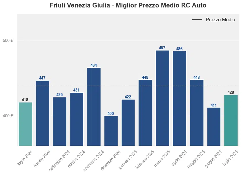 A luglio 2025 il premio medio RC auto in Friuli Venezia Giulia è 428,28€; confrontando i prezzi anno su anno emerge un aumento del 2,37% rispetto ai 418,36€ dello stesso mese dell’anno precedente.