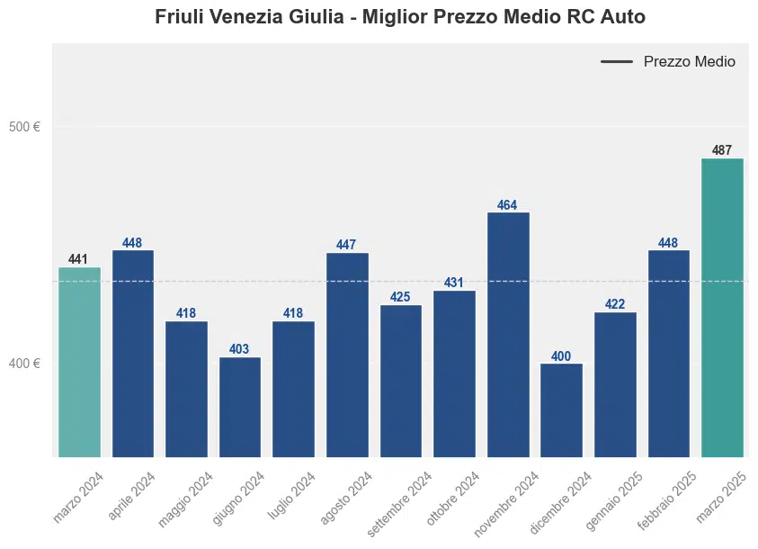 Il prezzo medio dell’assicurazione auto in Friuli Venezia Giulia a marzo 2025 è stato di 487,44€. Questo rappresenta un aumento del 10,31% rispetto allo stesso mese dell’anno precedente, quando il premio medio era di 441,88€.