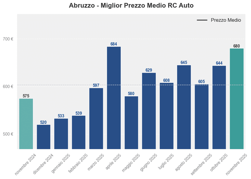 In Abruzzo a novembre 2025 il prezzo medio RC auto è 680,08€, con un aumento del 18,16% rispetto ai 575,56€ dello stesso mese dell’anno precedente; confrontando i prezzi, il miglior prezzo medio è 644,26€ contro una media italiana di 666,13€. Tutti i dettagli sono disponibili sull’assicurazione auto in Abruzzo.