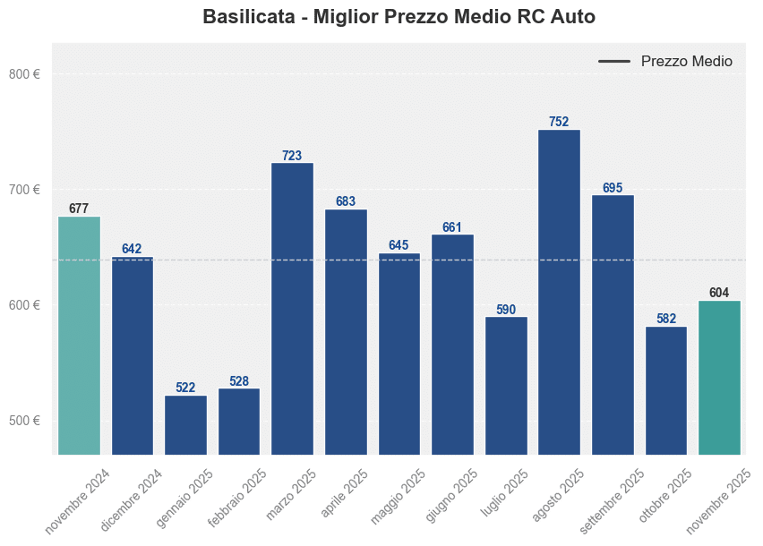 Confrontando i prezzi anno su anno, in Basilicata a novembre 2025 il prezzo medio RC auto è 604,84€, in calo del -10,66% rispetto ai 677,04€ di un anno prima. A novembre 2025 il miglior prezzo medio è 582,93€ (contro i 666,13€ nazionali) e il comparatore consente un risparmio medio del 78,05%, pari a 2150,74€, tra prezzo più alto e più basso rilevati; per dettagli consulta l’assicurazione auto in Basilicata.