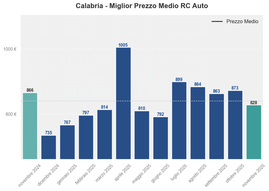 Confrontando i prezzi anno su anno, in Calabria a novembre 2025 il premio medio è stato di 828,38€, in calo del -4,39% rispetto ai 866,46€ dell’anno precedente. A novembre 2025 il miglior prezzo medio rilevato è stato di 873,12€, a fronte di una media italiana di 666,13€, e il comparatore ha permesso un risparmio fino al 69,81% pari a 1915,17€ (approfondisci l’assicurazione auto in Calabria).