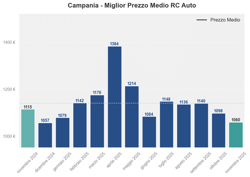 A novembre 2025, il prezzo medio dell’RC auto in Campania è di 1.060,04€, in calo del -5,01% rispetto a novembre 2024 (1.115,98€). Confrontando i prezzi, il miglior prezzo medio rilevato è 1.098,83€, superiore alla media italiana di 666,13€ (novembre 2025): scopri di più su assicurazione auto in Campania.