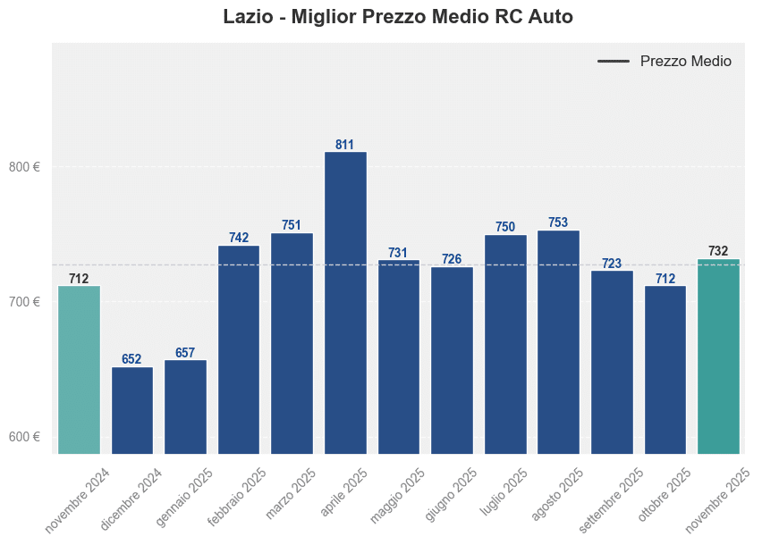 A novembre 2025, il miglior prezzo medio in regione è stato di 645,94€, inferiore alla media italiana di 666,13€, e il comparatore 6sicuro ha permesso un risparmio fino al 56,02%, pari a 741,14€, tra il prezzo più alto e quello più basso rilevato.