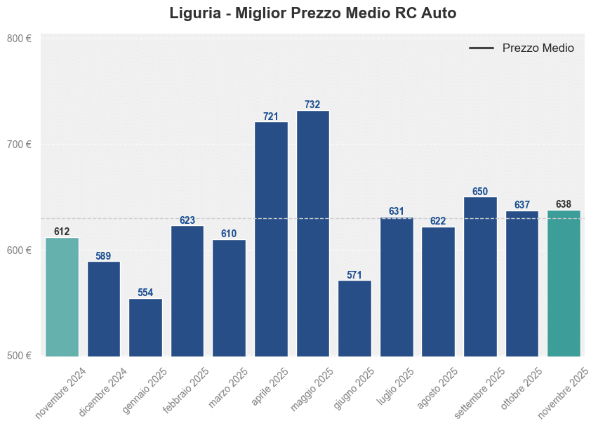In Liguria a novembre 2025 il prezzo medio RC auto è 638,9€, con un aumento del 4,39% su base annua rispetto ai 612,06€ di un anno prima; il miglior prezzo medio è 637,19€, inferiore alla media italiana di 666,13€. Confrontando i prezzi con la assicurazione auto in Liguria si può ottenere un risparmio del 55,94% pari a 811,33€, differenza tra il prezzo più alto e il prezzo più basso mediamente rilevato.
