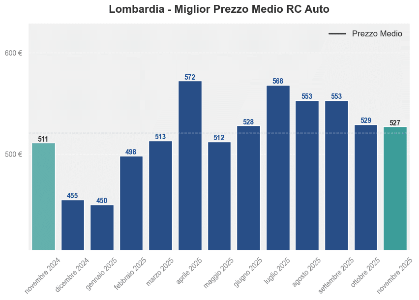 Confrontando i prezzi emerge che in Lombardia a novembre 2025 il prezzo medio è 527,63€, con +3,11% su base annua rispetto ai 511,72€ di novembre 2024. Il miglior prezzo medio è 529,87€, inferiore alla media italiana di 666,13€; maggiori dettagli sull’assicurazione auto in Lombardia sono disponibili qui.