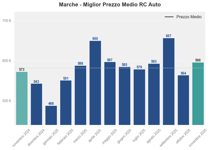 Nelle Marche a novembre 2025 il prezzo medio RC auto è 596,46€, con aumento del 4,03% anno su anno rispetto ai 573,37€; approfondimenti su assicurazione auto nelle Marche. Confrontando i prezzi, il miglior prezzo medio è 564,8€ (contro 666,13€ nazionali) e il comparatore 6sicuro consente un risparmio medio del 53,45% pari a 684,95€.