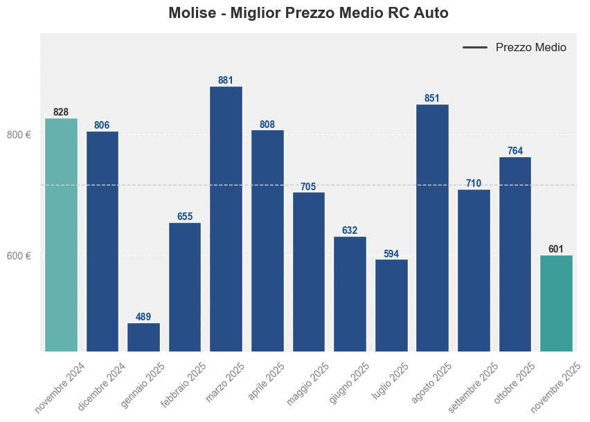 A novembre 2025 il prezzo medio dell’assicurazione auto in Molise è stato di 601,59€, con un calo del -27,4% rispetto agli 828,61€ di un anno prima; dettagli su assicurazione auto in Molise. Confrontando i prezzi, il miglior prezzo medio in regione è stato di 764,04€ contro una media italiana di 666,13€.