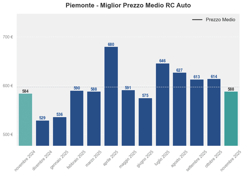 Confrontando i prezzi anno su anno, il premio medio RC in Piemonte a novembre 2025 è di 588,55€, in aumento dello 0,78% rispetto ai 584,01€ di un anno prima. A novembre 2025 il miglior prezzo medio è 614,81€, più conveniente della media italiana di 666,13€, e il comparatore consente un potenziale risparmio del 56,18% pari a 754,44€ sull’assicurazione auto in Piemonte.