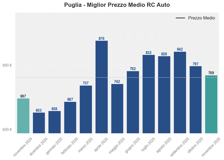 In Puglia a novembre 2025 il prezzo medio dell’RC auto è stato di 769,26€ (assicurazione auto in Puglia). Rispetto a novembre 2024 si registra un aumento del 10,3%, con premio medio precedente di 697,42€.