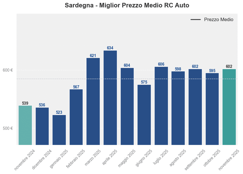 Confrontando i prezzi, in Sardegna il prezzo medio di novembre 2025 è stato di 602,72€, con un aumento annuo dell’11,65% rispetto ai 539,83€ dello stesso mese dell’anno precedente; maggiori dettagli nell’assicurazione auto in Sardegna. A novembre 2025 il miglior prezzo medio rilevato è stato di 595,8€, inferiore alla media italiana di 666,13€.