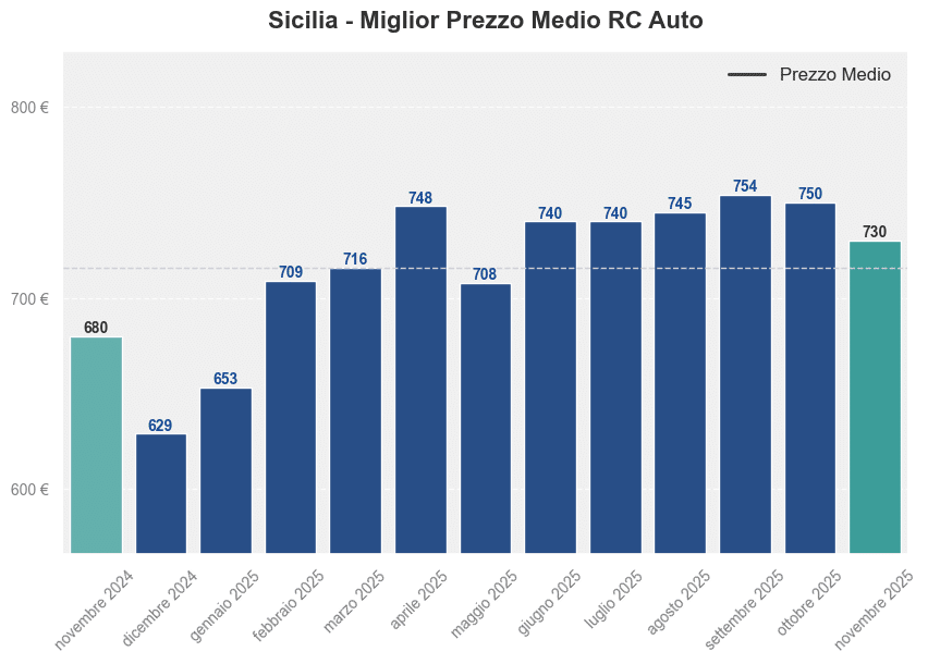 In Sicilia, a novembre 2025, il prezzo medio RC auto è stato di 730,89€, con un +7,39% rispetto allo stesso mese dell’anno precedente (680,58€). A novembre 2025 il miglior prezzo medio è stato di 750,04€, superiore alla media italiana di 666,13€, e confrontando i prezzi con 6sicuro si può risparmiare fino al 67,66% ovvero 1528,85€ come indicato nell’analisi sull’ assicurazione auto in Sicilia.