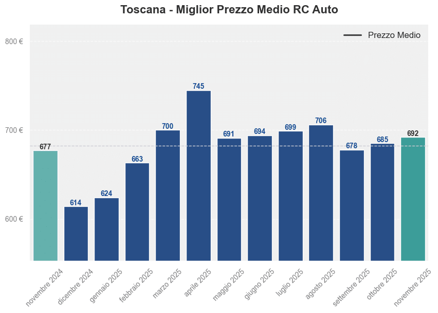 A novembre 2025, il prezzo medio dell’RC auto in Toscana è stato di 692,35€, in aumento del 2,13% su base annua (novembre 2024: 677,92€) — dettagli su assicurazione auto in Toscana. Confrontando i prezzi, il miglior prezzo medio rilevato è 685,66€, superiore alla media italiana di 666,13€, e il risparmio potenziale raggiunge il 51,88% pari a 746,34€.