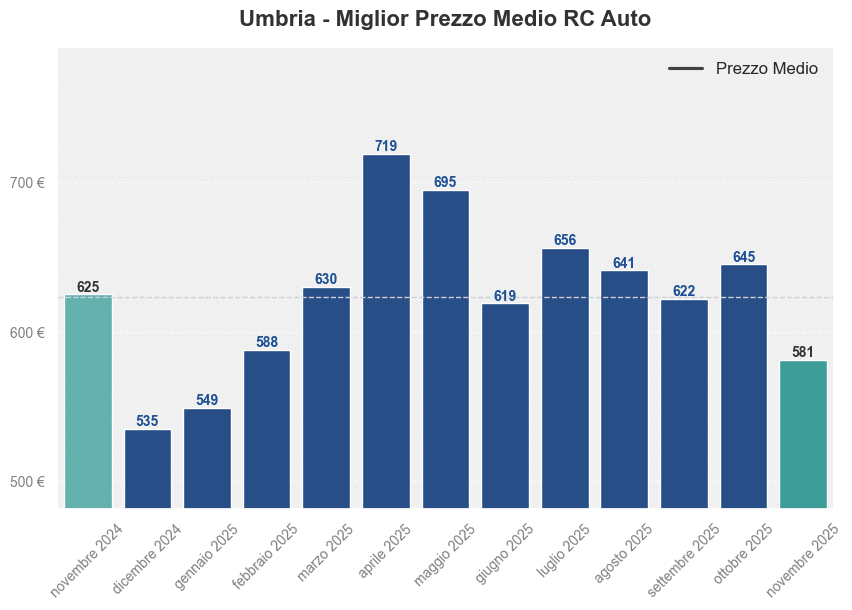 A novembre 2025, il prezzo medio dell’assicurazione auto in Umbria è stato di 581,74€, in calo del -6,96% rispetto allo stesso mese dell’anno precedente, quando era 625,27€.