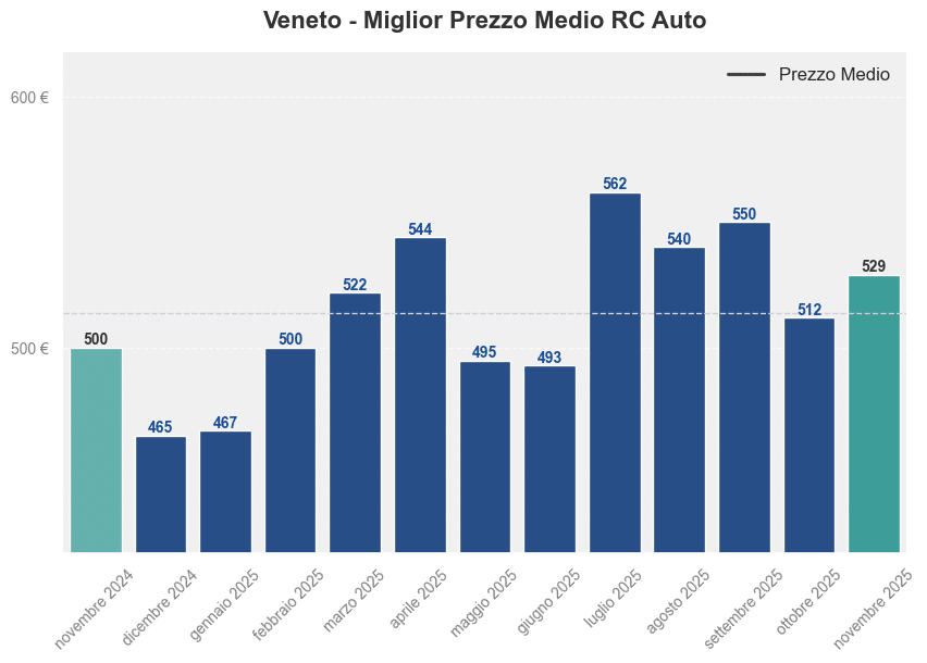 In Veneto a novembre 2025 il prezzo medio è stato di 529,84€ e, confrontando i prezzi con lo stesso mese del 2024, si rileva un +5,87% rispetto a 500,47€ (fonte assicurazione auto in Veneto). Nello stesso periodo il miglior prezzo medio regionale è stato di 512,39€, a fronte di una media italiana pari a 666,13€.