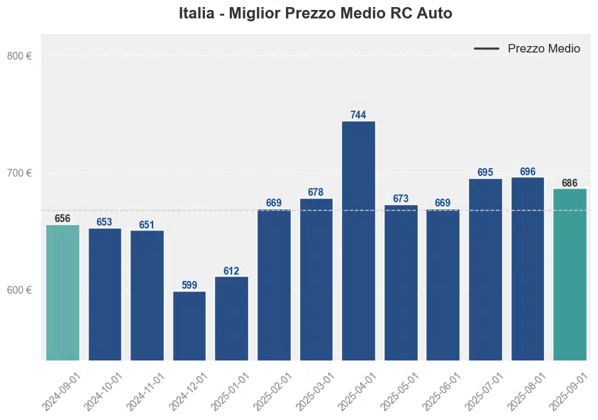 Secondo l’Osservatorio prezzi di 6Sicuro, il prezzo medio dell’assicurazione RC Auto in Italia a settembre 2025 è stato di 686,5€. Nello stesso mese del 2024 il valore medio era 656,22€.