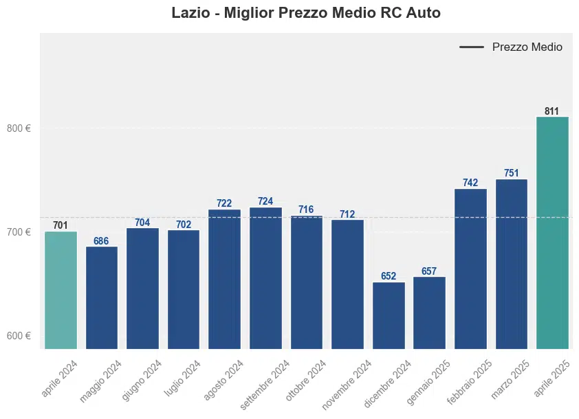 Il prezzo medio dell’assicurazione auto nel Lazio ad aprile 2025 è stato di 811,47€. Questo rappresenta un aumento del 15,61% rispetto allo stesso mese dell’anno precedente, quando il premio medio era di 701,92€.