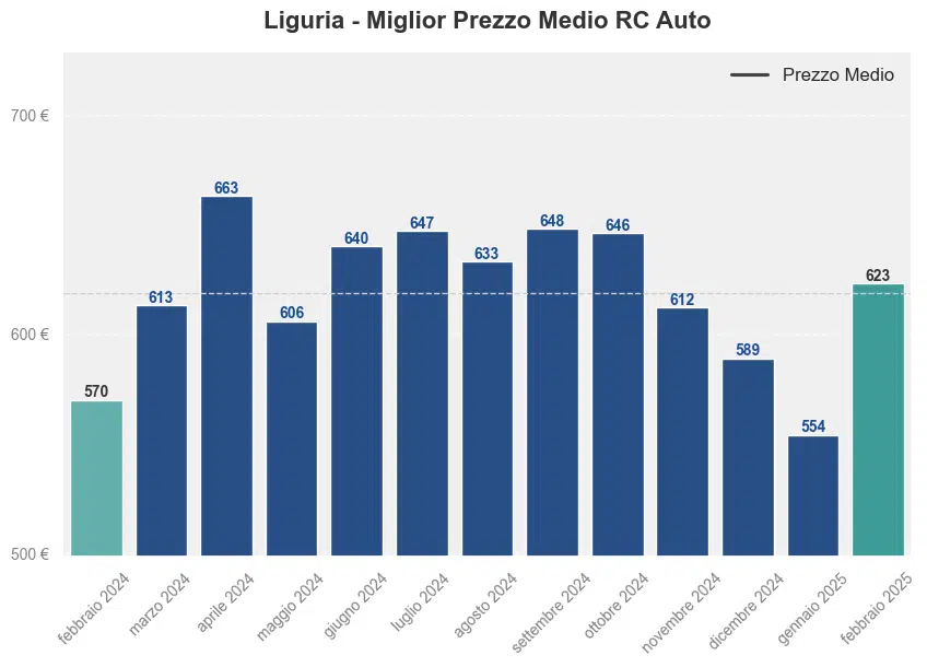 Il prezzo medio dell’assicurazione auto in Liguria a febbraio 2025 è stato di 623,1€. Questo rappresenta un aumento del 9,26% rispetto allo stesso mese dell’anno precedente, quando il premio medio era di 570,31€. Confrontando i prezzi con il mese precedente, si nota che il miglior prezzo medio era di 554,95€, evidenziando un incremento significativo.