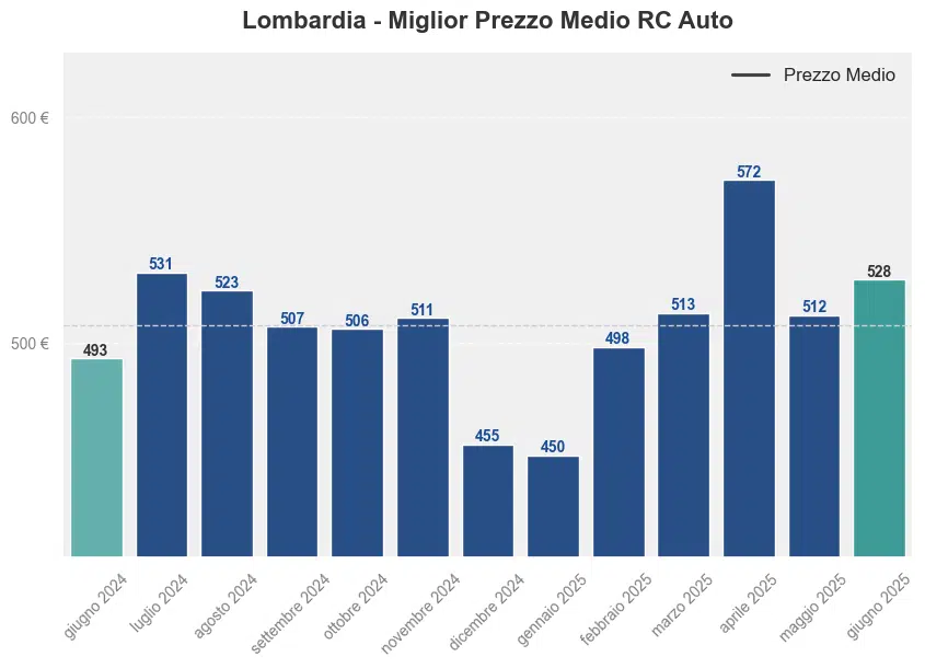Il prezzo medio dell’assicurazione auto in Lombardia a giugno 2025 è stato di 528,56€. Confrontando i prezzi con lo stesso mese dell’anno precedente, si registra un aumento del 7,07%, dato che nel giugno 2024 il premio medio era di 493,64€.