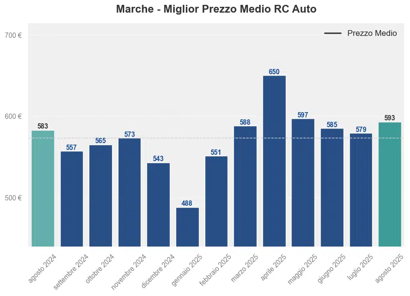 Ad agosto 2025, nelle Marche il prezzo medio RC auto è stato di 593,42€. Confrontando i prezzi anno su anno, si registra un +1,78% rispetto ai 583,07€ di agosto 2024.
