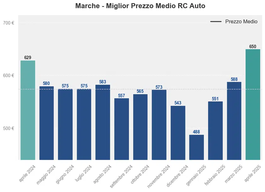 Nel mese precedente, il miglior prezzo medio nelle Marche era di 588,08€. Confrontando questo dato con quello di aprile 2025, si nota un significativo aumento. I conducenti della regione dovrebbero considerare queste variazioni quando scelgono la loro polizza assicurativa.