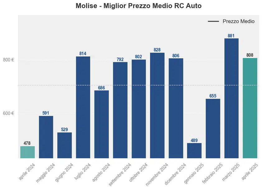 In Molise, il prezzo medio dell’assicurazione auto ad aprile 2025 è stato di 808,55€. Questo rappresenta un significativo aumento del 69,01% rispetto allo stesso mese dell’anno precedente, quando il premio medio era di 478,41€. Tale incremento può influenzare notevolmente il budget delle famiglie molisane.