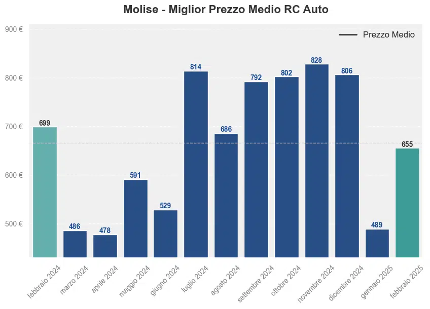 Il prezzo medio dell’assicurazione auto in Molise a febbraio 2025 è stato di 655,99€. Questo rappresenta un calo del -6,21% rispetto allo stesso mese dell’anno precedente, quando il premio medio era di 699,42€. Tale riduzione può essere vista come un segnale positivo per i consumatori della regione.