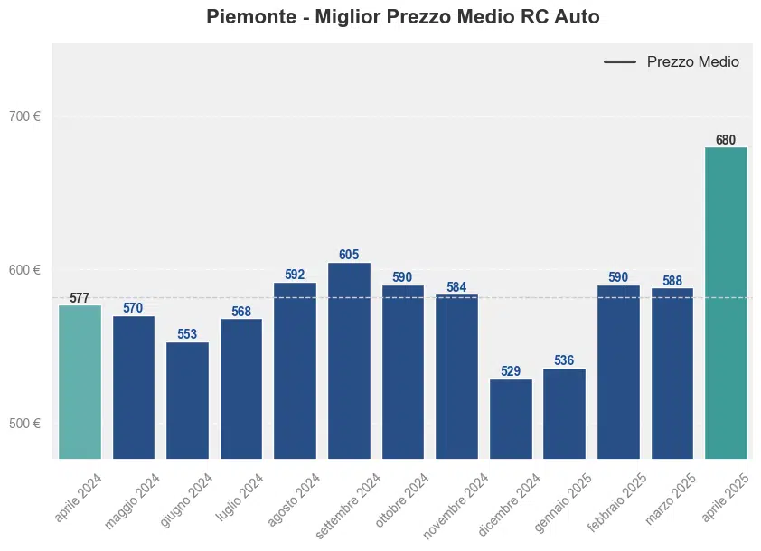 Il prezzo medio dell’assicurazione auto in Piemonte ad aprile 2025 è stato di 680,07€. Rispetto allo stesso mese dell’anno precedente, si è registrato un aumento del 17,7%, passando da 577,78€ a 680,07€. Questo incremento può influenzare le decisioni di acquisto delle famiglie piemontesi.