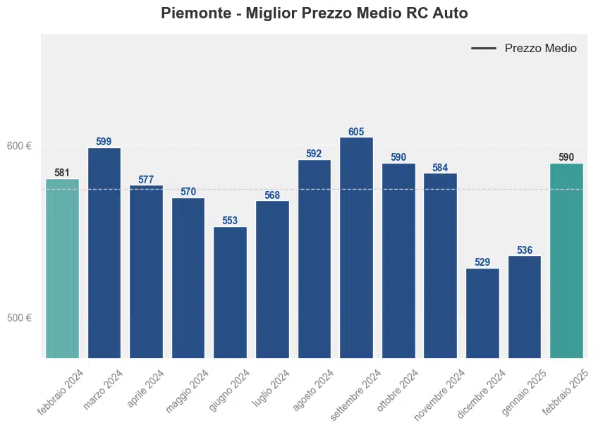 Il prezzo medio dell’assicurazione auto in Piemonte a febbraio 2025 è stato di 590,86€. Rispetto allo stesso mese dell’anno precedente, si è registrato un aumento del 1,68%, passando da 581,1€ a 590,86€. Questo incremento può influenzare le decisioni di acquisto dei consumatori nella regione.
