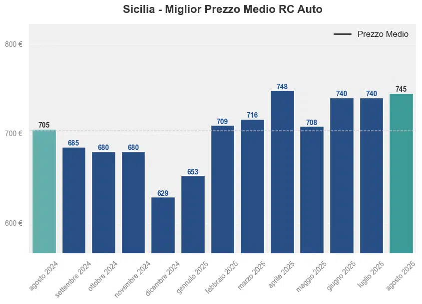 In Sicilia ad agosto 2025 il prezzo medio dell’assicurazione auto è stato di 745,0€. Confrontando i prezzi con lo stesso mese dell’anno precedente, emerge un +5,65% rispetto ai 705,19€.