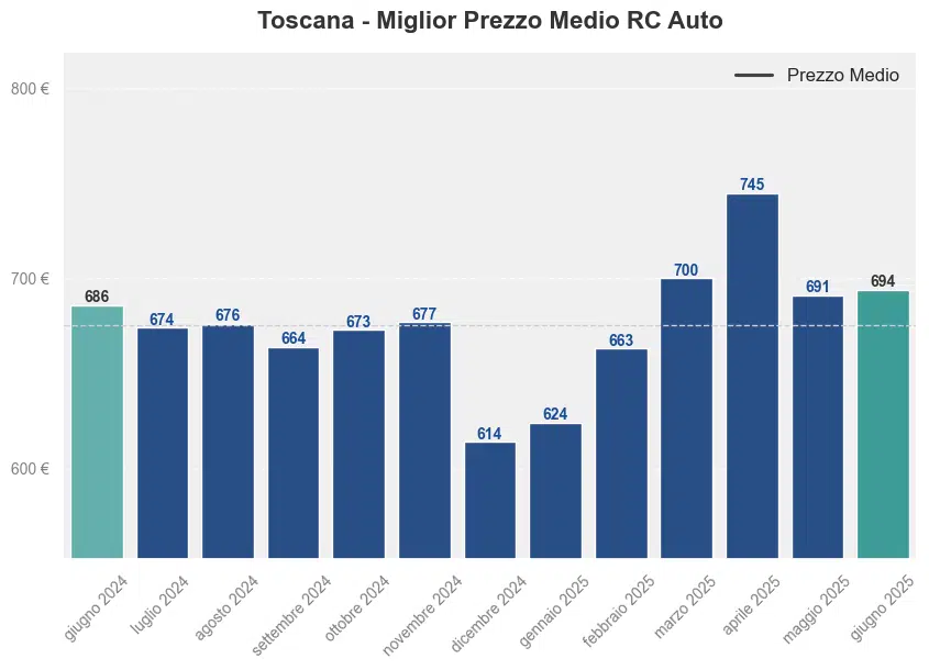 Il prezzo medio dell’assicurazione auto in Toscana a giugno 2025 è stato di 694,97€. Confrontando i prezzi con lo stesso mese dell’anno precedente, si registra un aumento dell’1,3%, dato che a giugno 2024 il premio medio era di 686,06€.