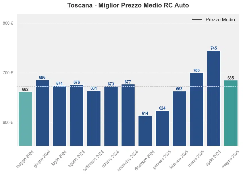 Il prezzo medio dell’assicurazione auto in Toscana a maggio 2025 è stato di 685,04€. Confrontando i prezzi con lo stesso mese dell’anno precedente, si registra un aumento del 3,34%, dato che a maggio 2024 il premio medio era di 662,9€.