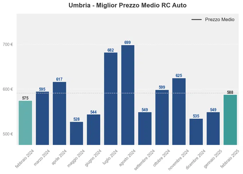 Il prezzo medio dell’assicurazione auto in Umbria a febbraio 2025 è stato di 588,73€. Questo rappresenta un aumento del 2,38% rispetto allo stesso mese dell’anno precedente, quando il premio medio era di 575,05€.