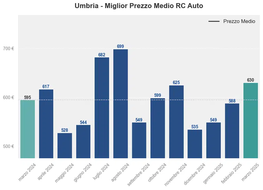 Il prezzo medio dell’assicurazione auto in Umbria a marzo 2025 è stato di 630,34€. Rispetto allo stesso mese dell’anno precedente, si è registrato un aumento del 5,89%, passando da 595,27€ a 630,34€. Questo incremento può influenzare il budget delle famiglie umbre.