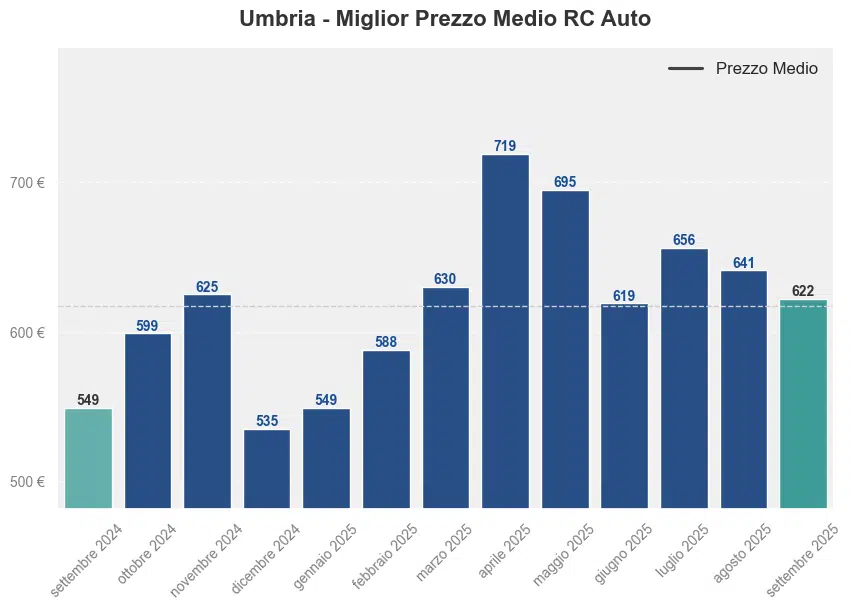 In Umbria, a settembre 2025, il prezzo medio dell’RC auto è 622,23€. Confrontando i prezzi anno su anno, si registra un aumento del 13,14% rispetto ai 549,95€ dello stesso mese dell’anno precedente.