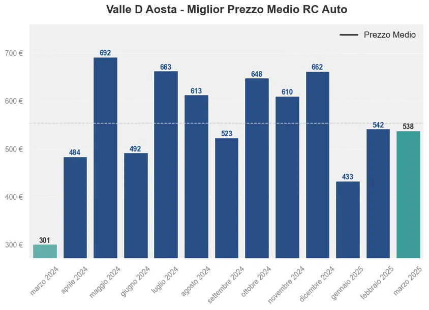 Il prezzo medio dell’assicurazione auto in Valle D’Aosta a marzo 2025 è stato di 538,86€. Questo rappresenta un significativo aumento del 78,85% rispetto allo stesso mese dell’anno precedente, quando il premio medio era di 301,29€.